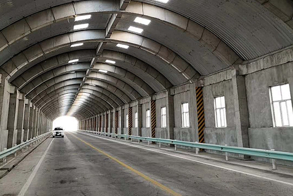 S201線路途徑瑪依塔斯風(fēng)區(qū),公司所承建的防風(fēng)雪試驗(yàn)工程在風(fēng)雪災(zāi)害最為嚴(yán)重的路段。該項(xiàng)目采用在路面上方建設(shè)一座仿造隧道式的棚洞,并用防雪網(wǎng)與擋雪板對(duì)棚洞的進(jìn)出口及風(fēng)吹雪嚴(yán)重路段進(jìn)行防護(hù),以防止吹雪在路面和棚洞洞口處堆積造成通行困難。棚洞主體采用鋼筋混凝土框架結(jié)構(gòu),能抵抗12級(jí)大風(fēng)。為了行車安全,還在棚洞內(nèi)部設(shè)置了波形梁護(hù)欄。該項(xiàng)目也是目前國內(nèi)首例采用棚洞工程進(jìn)行吹雪防治的嘗試,開辟了新疆地區(qū)科技創(chuàng)新成果與實(shí)際工程結(jié)合應(yīng)用的新篇章。