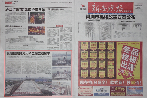 近日,《新安晚報環(huán)湖新聞》持續(xù)報道公司承建的巢湖亞父路項目裕溪河特大橋施工進展情況。