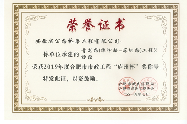 市政分公司三項目喜獲“廬州杯” 發(fā)布時間:2019年07月29日 來源:市政分公司 發(fā)布人: 作者:王東 瀏覽:3697次 近日從合肥市政工程協(xié)會獲悉,公司承建的阜陽北路一標、阜陽北路二標、青龍路二標等項目喜獲“廬州杯”。截至目前,市政分公司已累計獲得19個“廬州杯”獎項。