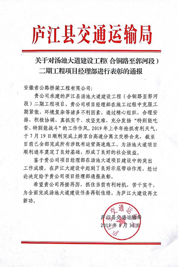 近日,廬江縣交通運輸局發(fā)文對湯池大道二期、郭柯路兩項目進行通報表彰,高度肯定了項目團隊管理水平及工程形象進度等工作。