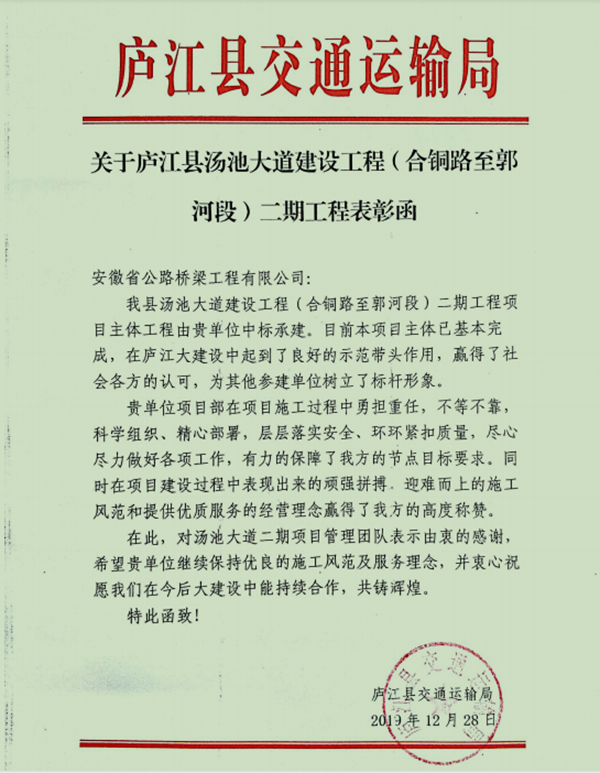 近日,公司收到廬江縣交通運輸局寄來的表揚信,對徽州大道南延工程(廬江段)二標段、湯池大道建設工程(合銅路至郭河段)二期及合安高速郭河道口連接線(郭柯路)工程等三個項目積極克服各類困難,高標準、嚴要求推進施工生產(chǎn)給予表揚和感謝。