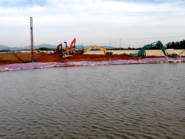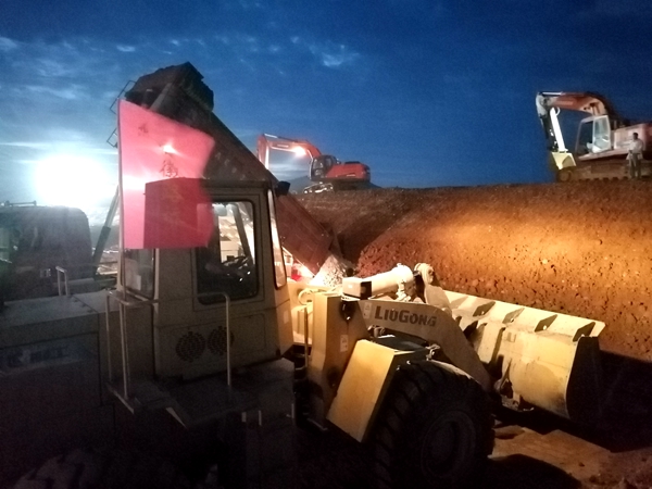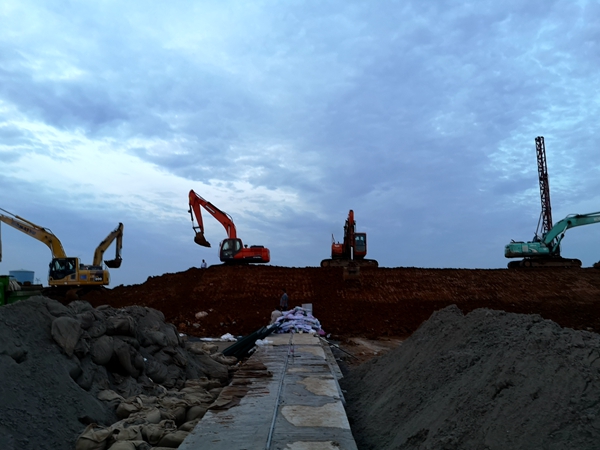巢湖市東外壞旗山撇洪溝,位于巢湖鼓山腳下,連接清溪河支流,連日降雨,清溪河水位暴漲,防汛壓力巨大,經(jīng)開區(qū)的人民生命和財(cái)產(chǎn)安全受到嚴(yán)重威脅。經(jīng)巢湖市政府研究決定,在旗山撇洪溝和清溪河支流交匯處筑壩,將撇洪溝東側(cè)低洼處作為清溪河支流泄洪預(yù)備區(qū),以應(yīng)對清溪河水位暴漲危險(xiǎn)。接到汛情指令,巢湖市亞父路項(xiàng)目部迅速出動,組建防汛突擊隊(duì),調(diào)集挖掘機(jī)、裝載機(jī)等機(jī)械設(shè)備迅速奔赴搶險(xiǎn)一線,連續(xù)奮戰(zhàn)兩天三夜,填筑黃土近10000方,碎石1500方,拋石700噸,圓滿完成了底寬22米,上寬10米,高5米,長110米的筑壩任務(wù),確保了經(jīng)開區(qū)的人民生命和財(cái)產(chǎn)安全。