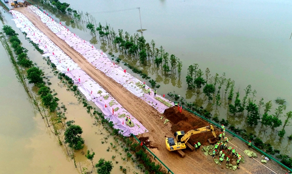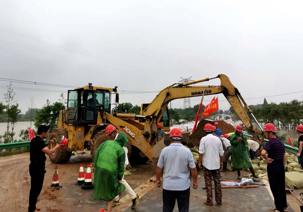 7月23日下午5時,石頭鎮(zhèn)水位上漲迅猛,廬江縣重要防汛通道X092線150米漫水公路淹沒,嚴重威脅當?shù)厝罕娚钜约胺姥闯鲂?。徽州大道項目迅速行動,組織人員70余人,機械數(shù)十臺,挖土2000方,裝填沙袋5000只,構筑起兩道安心墻。