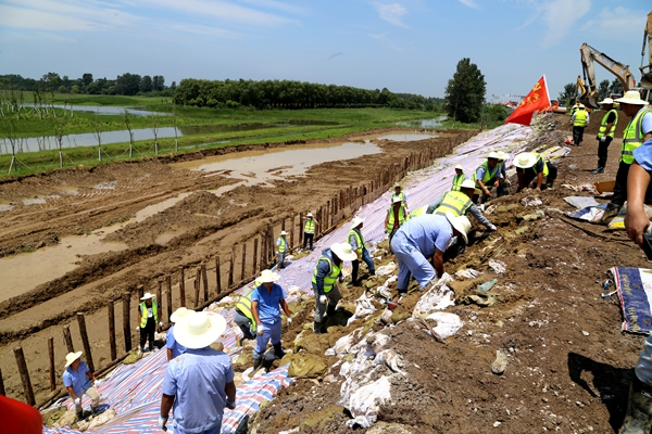 25日7時(shí),市政分公司再次組織400多名職工增援現(xiàn)場(chǎng)。他們中有的是剛從其他抗洪點(diǎn)轉(zhuǎn)戰(zhàn)過(guò)來(lái)的,有的是主動(dòng)放棄休假時(shí)間請(qǐng)戰(zhàn)過(guò)來(lái)的,他們的任務(wù)就是完成防浪護(hù)坡工作。隨著一根根木樁打下去、一張張雨布蓋下來(lái)、一袋袋沙土堆起來(lái),堤壩變得更加穩(wěn)固。