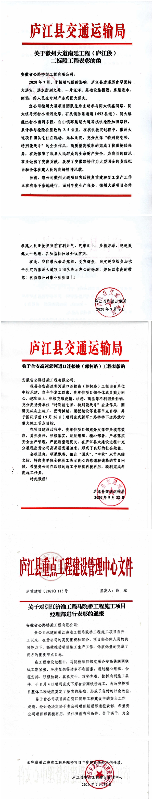 近日,廬江縣交通運(yùn)輸局、廬江縣重點(diǎn)工程建設(shè)管理中心先后發(fā)來(lái)表彰信,對(duì)公司承建的徽州大道南延工程(廬江段)二標(biāo)段、合安高速郭河道口連接線(郭柯路)工程、引江濟(jì)淮馬院橋工程項(xiàng)目戰(zhàn)疫情、抗洪水、搶進(jìn)度、樹形象,高標(biāo)準(zhǔn)、高質(zhì)量推進(jìn)施工生產(chǎn)給予表?yè)P(yáng)和感謝。
