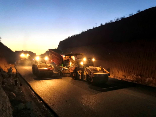 項(xiàng)目全長(zhǎng)34.6公里,途徑四個(gè)鄉(xiāng)鎮(zhèn),在完成路基施工后,根據(jù)交驗(yàn)時(shí)間分段進(jìn)入路面攤鋪。立足實(shí)際情況,項(xiàng)目充分發(fā)揮主觀能動(dòng)性,尋找一切可利用的工作面,精心策劃、見(jiàn)縫插針組織路面施工。在率先完成一工區(qū)水穩(wěn)、瀝青攤鋪施工任務(wù)后,迅速組織精干力量,轉(zhuǎn)戰(zhàn)一二工區(qū)連接部分?jǐn)備伿┕?,僅用20余天打通了兩個(gè)工區(qū)的運(yùn)輸通道。