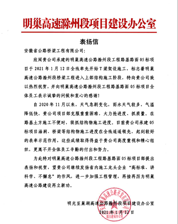 1月12日,明巢高速滁州段項(xiàng)目辦給公司來(lái)信,對(duì)公司承建的明巢高速05標(biāo)在全線率先開(kāi)始T梁架設(shè)進(jìn)行表?yè)P(yáng)。
