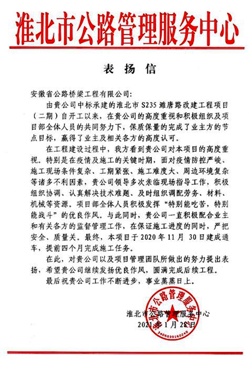 1月28日,淮北市公路管理服務(wù)中心向公司發(fā)來表揚(yáng)信,對(duì)淮北S235項(xiàng)目團(tuán)隊(duì)保質(zhì)保量提前完成施工任務(wù)給予表揚(yáng)。