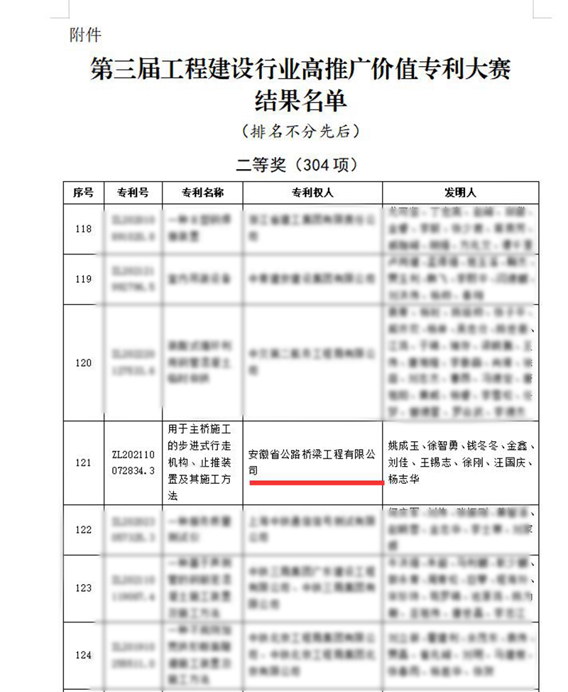 近日,中國施工企業(yè)管理協(xié)會“第三屆工程建設(shè)行業(yè)高推廣價值專利大賽決賽”評選結(jié)果揭曉。由公司報送的《用于主橋施工的步進式行走機構(gòu)、止推裝置及其施工方法》實用新型專利,在全國2498個參賽項目、19個復賽項目中脫穎而出,榮獲二等獎,實現(xiàn)了公司在該類別獎項的新突破。