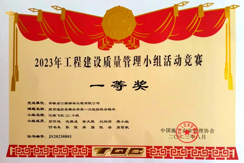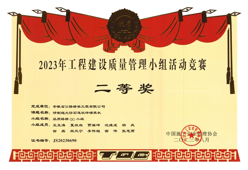8月11日,中國施工企業(yè)管理協(xié)會(huì)“2023年(首屆)工程建設(shè)行業(yè)質(zhì)量管理小組活動(dòng)高質(zhì)量發(fā)展大會(huì)”在山西太原順利閉幕。會(huì)議對各地區(qū)及行業(yè)協(xié)會(huì)推薦的1468個(gè)優(yōu)秀QC成果進(jìn)行了集中發(fā)布,其中橋梁分公司申報(bào)的QC成果《提高溫控管接頭安裝一次性驗(yàn)收合格率》榮獲一等獎(jiǎng),市政分公司申報(bào)的QC成果《提高地下車庫地坪施工合格率》《研制超大仿石道板磚鋪裝機(jī)》榮獲二等獎(jiǎng)。