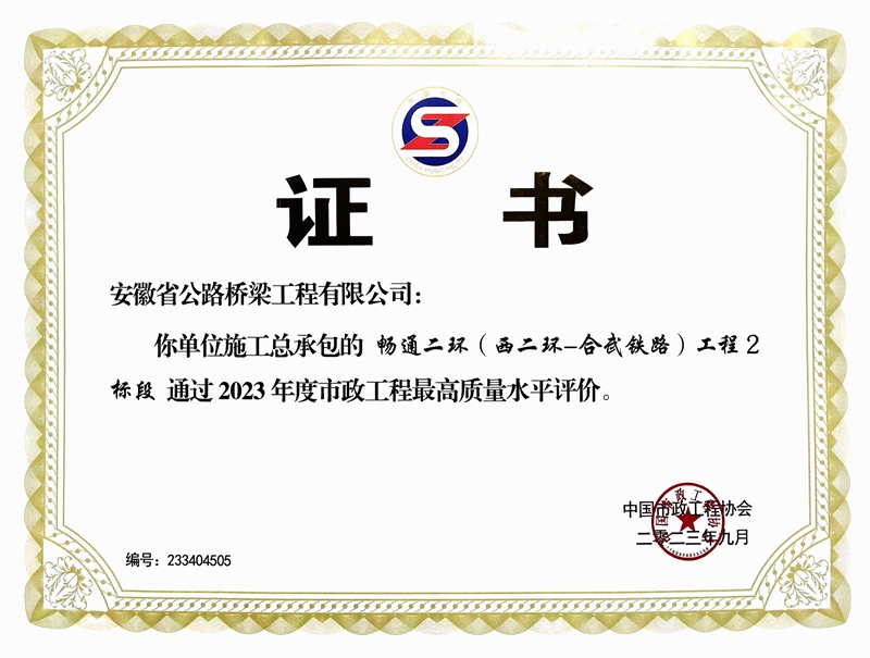 暢通二環(huán)(西二環(huán)-合武鐵路)工程2標(biāo)段榮獲市政最高質(zhì)量水平評價(jià)獎(jiǎng)