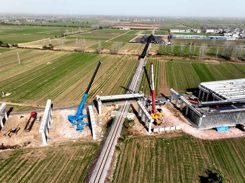 建設公司徐淮阜高速亳州段路基2標跨淮北礦業(yè)鐵路橋“跨鐵”位置第一片箱梁架設