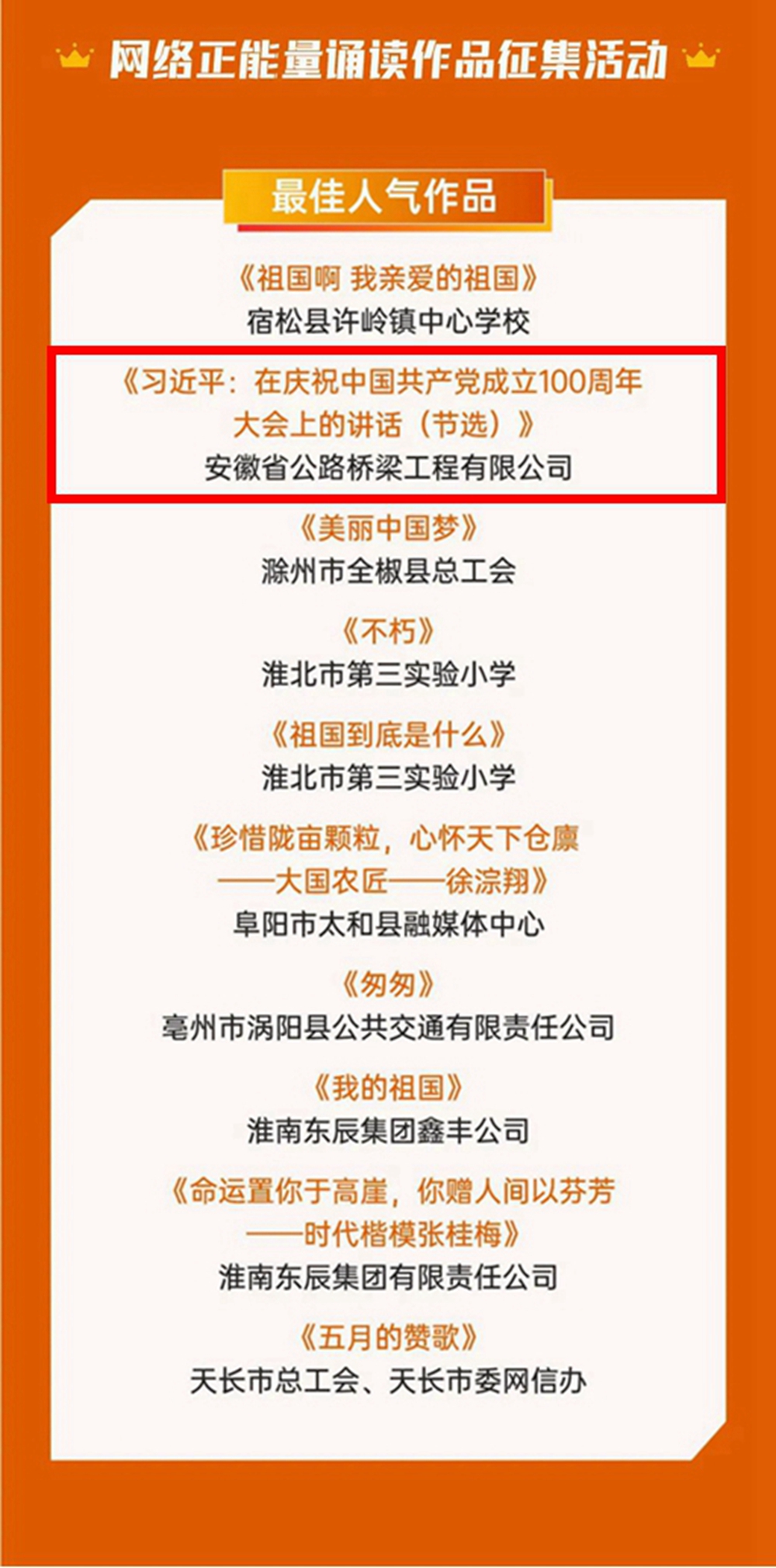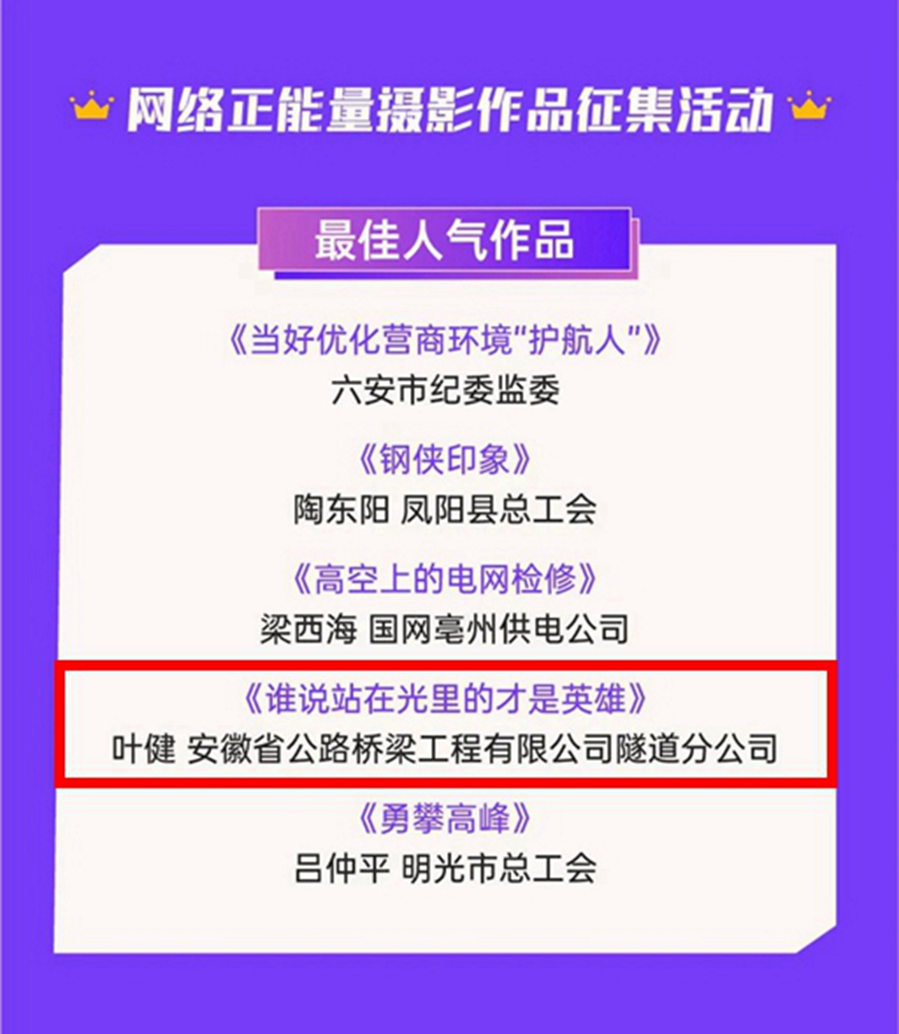 近日,安徽省總工會、省委網(wǎng)信辦聯(lián)合開展的“網(wǎng)聚職工正能量 團結奮斗新征程”主題活動優(yōu)秀獲獎名單公布,在文章征集、攝影作品征集、誦讀作品征集活動中,公司報送的多個作品獲獎。公司工會被安徽省總工會、省委網(wǎng)信辦聯(lián)合授予2023年全省工會“好網(wǎng)民”主題活動“優(yōu)秀組織單位”。