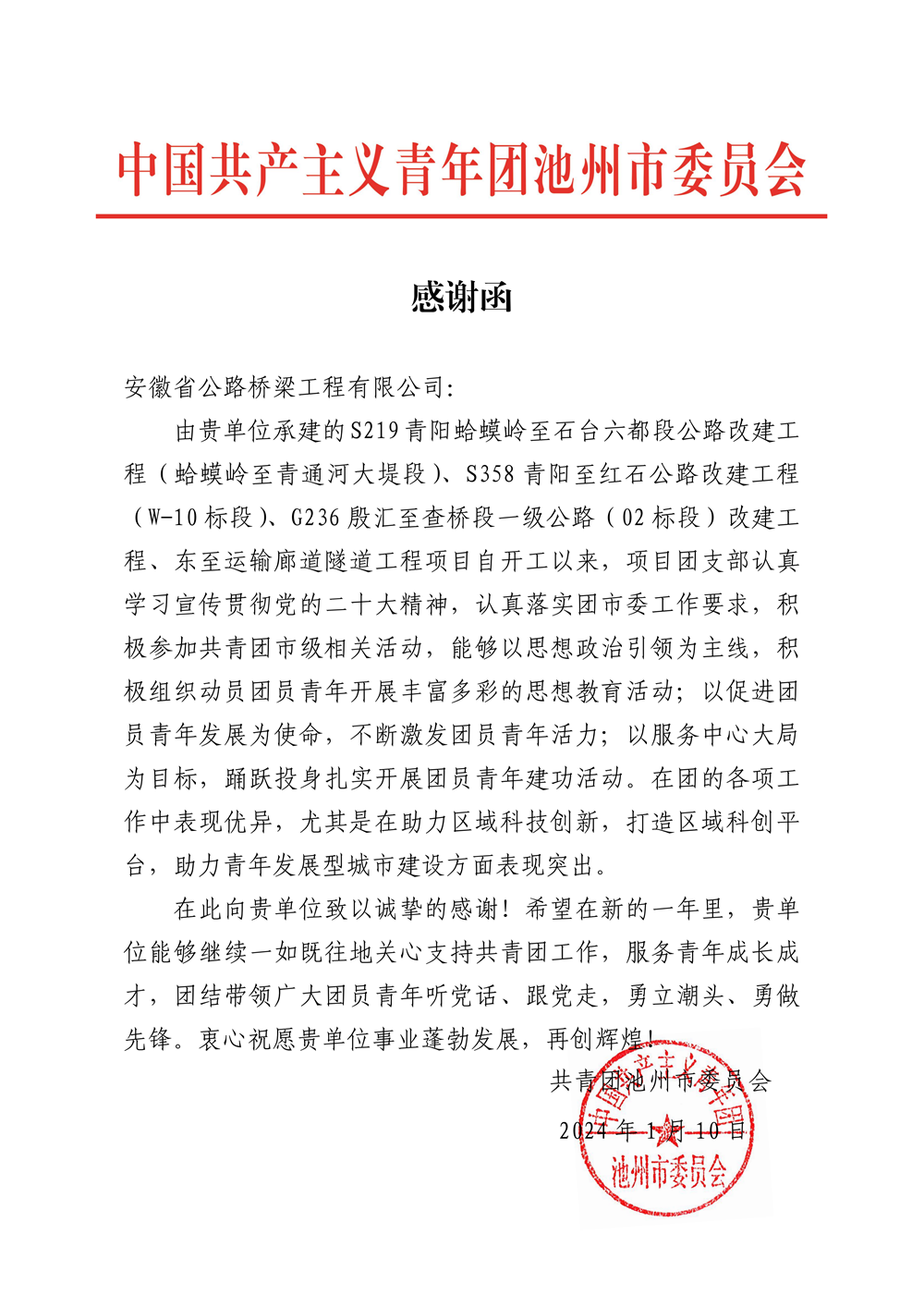 1月10日,公司收到共青團池州市委感謝函,對S219青陽蛤蟆嶺至青通河大堤段改建等4個項目堅持黨建帶團建,服務(wù)生產(chǎn)經(jīng)營工作,尤其是助力打造區(qū)域科創(chuàng)平臺,助力青年發(fā)展型城市建設(shè)方面的突出貢獻給予感謝。