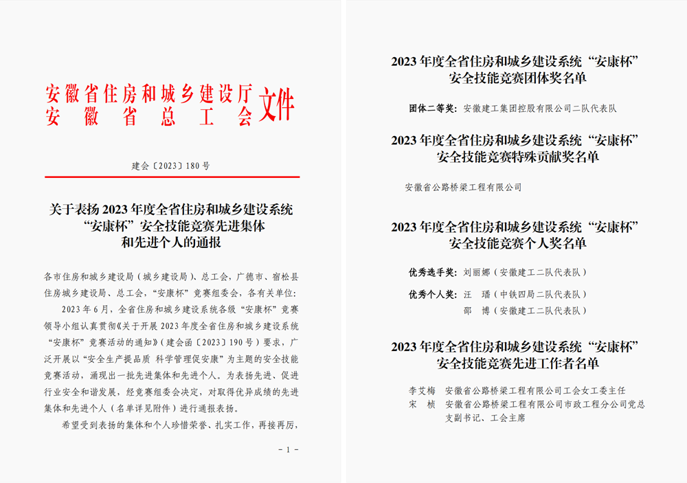 近日,安徽省總工會(huì)、住房城鄉(xiāng)建設(shè)廳聯(lián)合發(fā)布《關(guān)于表揚(yáng)2023年度全省住房和城鄉(xiāng)建設(shè)系統(tǒng)“安康杯”安全技能競(jìng)賽先進(jìn)集體和先進(jìn)個(gè)人的通報(bào)》,公司榮獲競(jìng)賽特殊貢獻(xiàn)獎(jiǎng),以公司選手為主力的安徽建工二隊(duì)獲得競(jìng)賽團(tuán)體二等獎(jiǎng)。公司職工宋楨、李艾梅獲競(jìng)賽“先進(jìn)工作者”,公司選手劉麗娜、邵博分獲競(jìng)賽“優(yōu)秀選手獎(jiǎng)”“優(yōu)秀個(gè)人獎(jiǎng)”。
