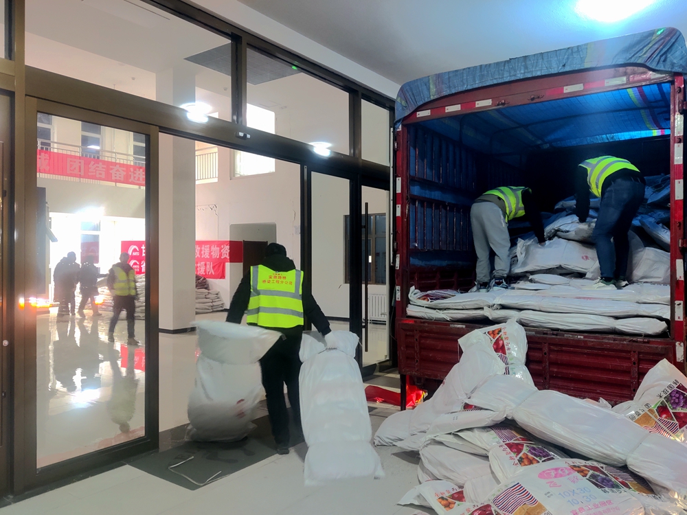 距積石山縣地震震中僅21公里的永靖縣劉家峽水庫楊塔鄉(xiāng)段環(huán)庫公路先后發(fā)生山體坍塌堵塞,嚴重阻礙交通出行。項目部在與當?shù)卣〉寐?lián)系后緊急出動,第一時間趕往現(xiàn)場開展清掃工作,歷經(jīng)4小時作業(yè)將落石全部清理完畢,確保道路通暢。項目部所在的楊塔鄉(xiāng)勝利村部分房屋出現(xiàn)大裂縫,為保障村民人身安全,項目部主動聯(lián)系有需要的村民到項目工人生活區(qū)進行取暖和避險。在得知積石山縣地震災區(qū)缺少彩條布及篷布等緊急物資時,項目迅速籌集采購彩條布、篷布共計50000平方米,并連夜送往災區(qū)以備使用。