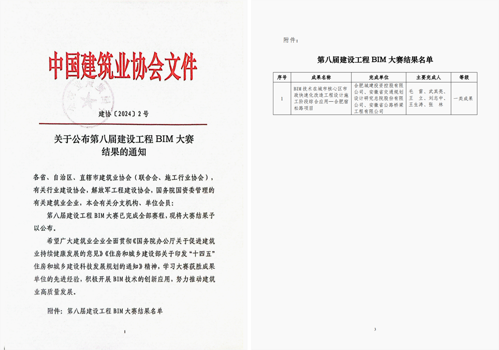1月23日,中國建筑業(yè)協(xié)會發(fā)布了《關(guān)于公布第八屆建設(shè)工程BIM大賽結(jié)果的通知》,公司承建的宿松路6標項目報送的“BIM技術(shù)在城市核心區(qū)市政快速化改造工程設(shè)計施工階段綜合應(yīng)用—合肥宿松路項目”榮獲一類成果。
