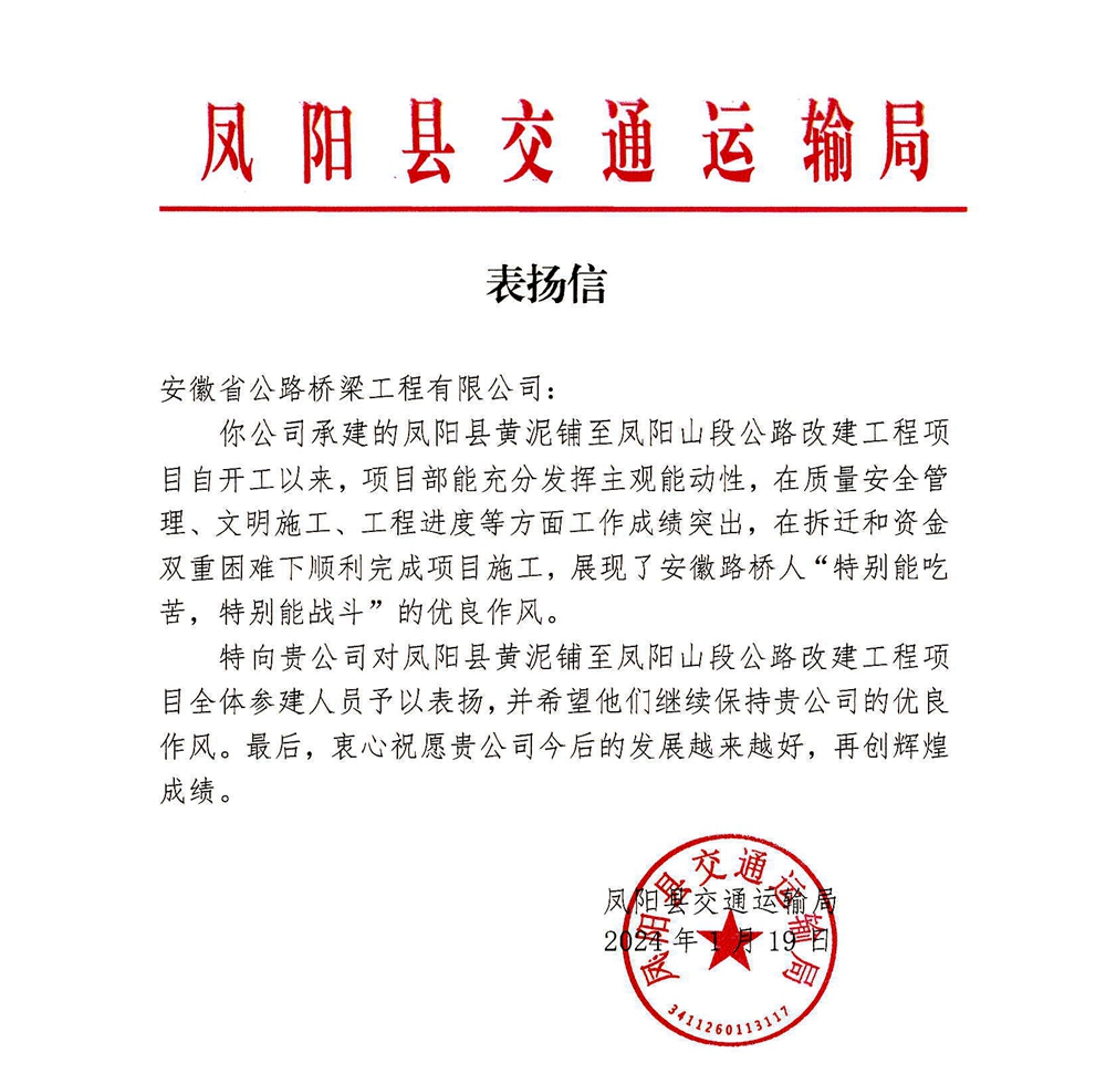 鳳陽(yáng)縣交通運(yùn)輸局來(lái)信表示,鳳臺(tái)縣黃鳳公路改建工程項(xiàng)目團(tuán)隊(duì)發(fā)揮主觀能動(dòng)性,在質(zhì)量安全管理、文明施工、工程進(jìn)度等方面工作成績(jī)突出,充分發(fā)揚(yáng)了安徽路橋“特別能吃苦、特別能戰(zhàn)斗”的企業(yè)作風(fēng)。