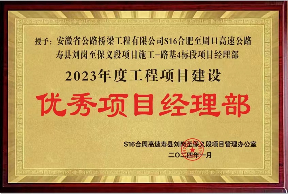 淮南交控(集團(tuán))有限公司S16合周高速壽縣劉崗至保義段項(xiàng)目辦發(fā)布2023年度“五比五看”評(píng)比得分通報(bào),公司承建的S16合周高速4標(biāo)東淝河大橋項(xiàng)目在全線脫穎而出,位列年度綜合考評(píng)第一名,獲通報(bào)表?yè)P(yáng),并被授予“優(yōu)秀項(xiàng)目經(jīng)理部”榮譽(yù)稱號(hào)。