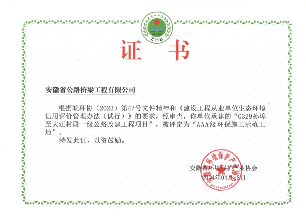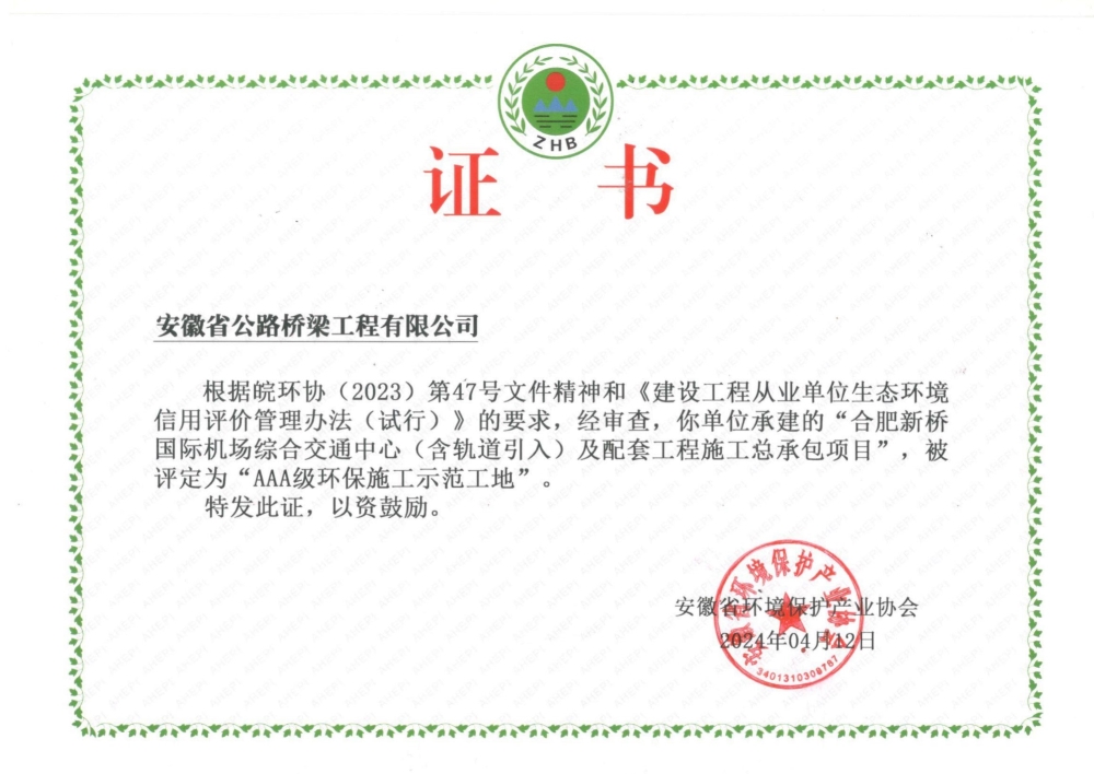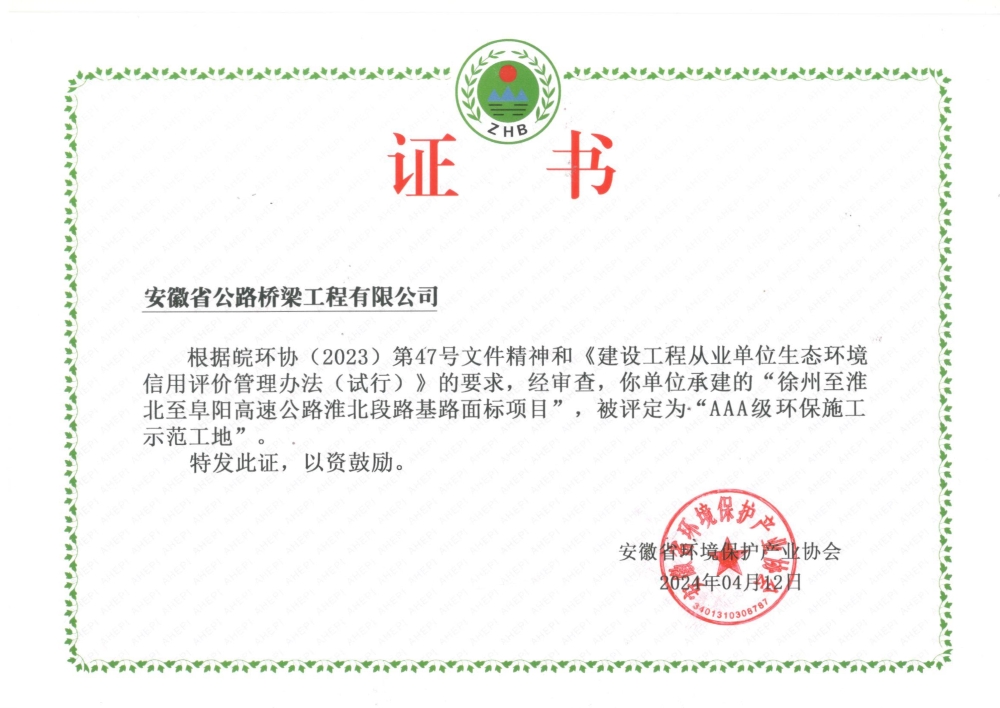 近日,安徽省環(huán)境保護(hù)產(chǎn)業(yè)協(xié)會公布了“2024年第2批建設(shè)工程從業(yè)單位生態(tài)環(huán)境信用評價(jià)結(jié)果”,由公司承建的徐州至淮北至阜陽高速公路淮北段路基路面標(biāo)、G329孫埠至大汪村段一級公路改建工程和合肥新橋國際機(jī)場綜合交通中心(含軌道引入)及配套工程施工總承包項(xiàng)目獲評安徽省“AAA級環(huán)保施工示范工地”稱號。