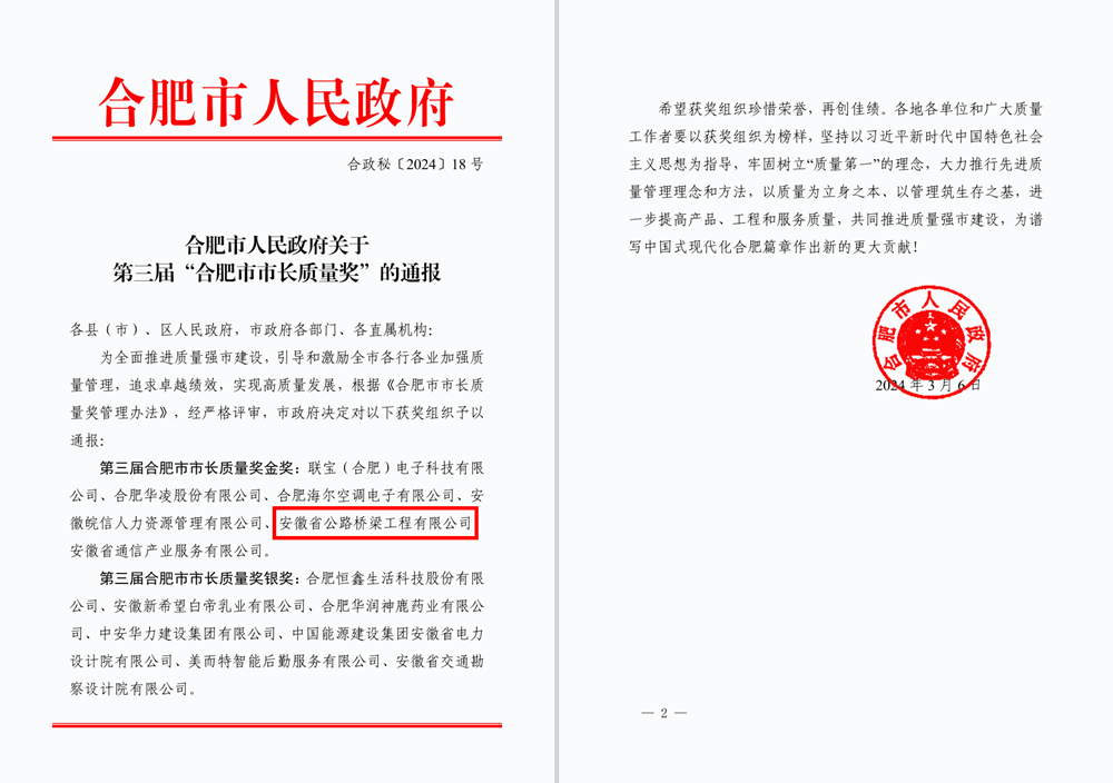 近日,合肥市人民政府公布了第三屆“合肥市市長質量獎”名單,安徽路橋獲評金獎。