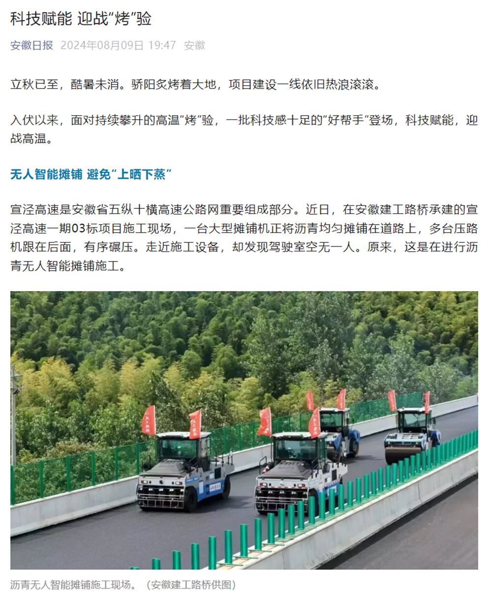 宣涇高速是安徽省五縱十橫高速公路網(wǎng)重要組成部分。近日,在安徽建工路橋承建的宣涇高速一期03標(biāo)項目施工現(xiàn)場,一臺大型攤鋪機(jī)正將瀝青均勻攤鋪在道路上,多臺壓路機(jī)跟在后面,有序碾壓。走近施工設(shè)備,卻發(fā)現(xiàn)駕駛室空無一人。原來,這是在進(jìn)行瀝青無人智能攤鋪施工。