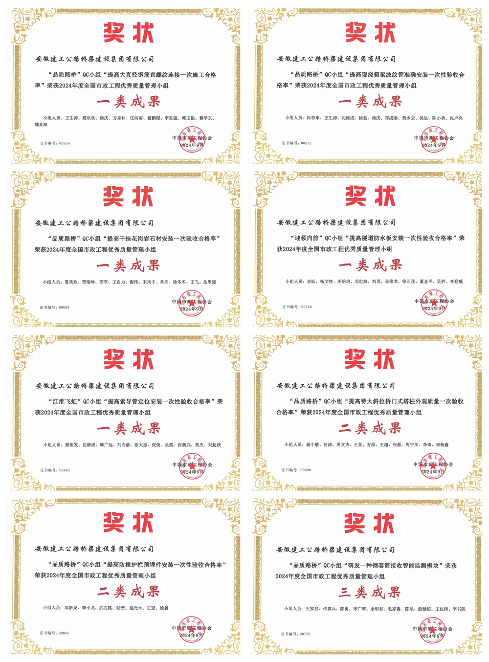 近日,中國市政工程協(xié)會正式公布了2024年度全國市政工程優(yōu)秀質量管理小組名單,公司8項QC成果脫穎而出,榮獲全國QC成果一等獎5項、二等獎2項、三等獎1項。