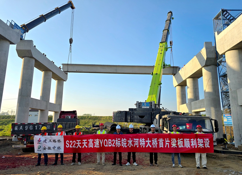 在S22天天高速YQB2標關鍵控制性工程——皖水河特大橋施工現(xiàn)場,項目部緊盯施工節(jié)點,壓實責任抓落實,順利完成首片預制箱梁架設。