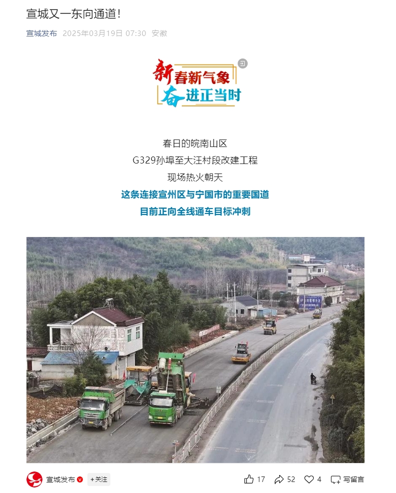春日的皖南山區(qū),G329孫埠至大汪村段改建工程現(xiàn)場(chǎng)熱火朝天。攤鋪機(jī)、壓路機(jī)與運(yùn)輸車輛轟鳴交織,滾燙的瀝青蒸騰起陣陣白霧。這條連接宣州區(qū)與寧國(guó)市的重要國(guó)道,目前正向全線通車目標(biāo)沖刺。作為融入長(zhǎng)三角的重要通道,項(xiàng)目建成后,宣城至寧國(guó)通行時(shí)間將大大縮短,惠及沿線10萬余群眾。