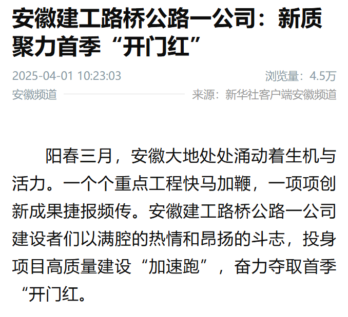 【央媒聚焦】新華社客戶端:安徽建工路橋公路一公司——新質聚力首季“開門紅”