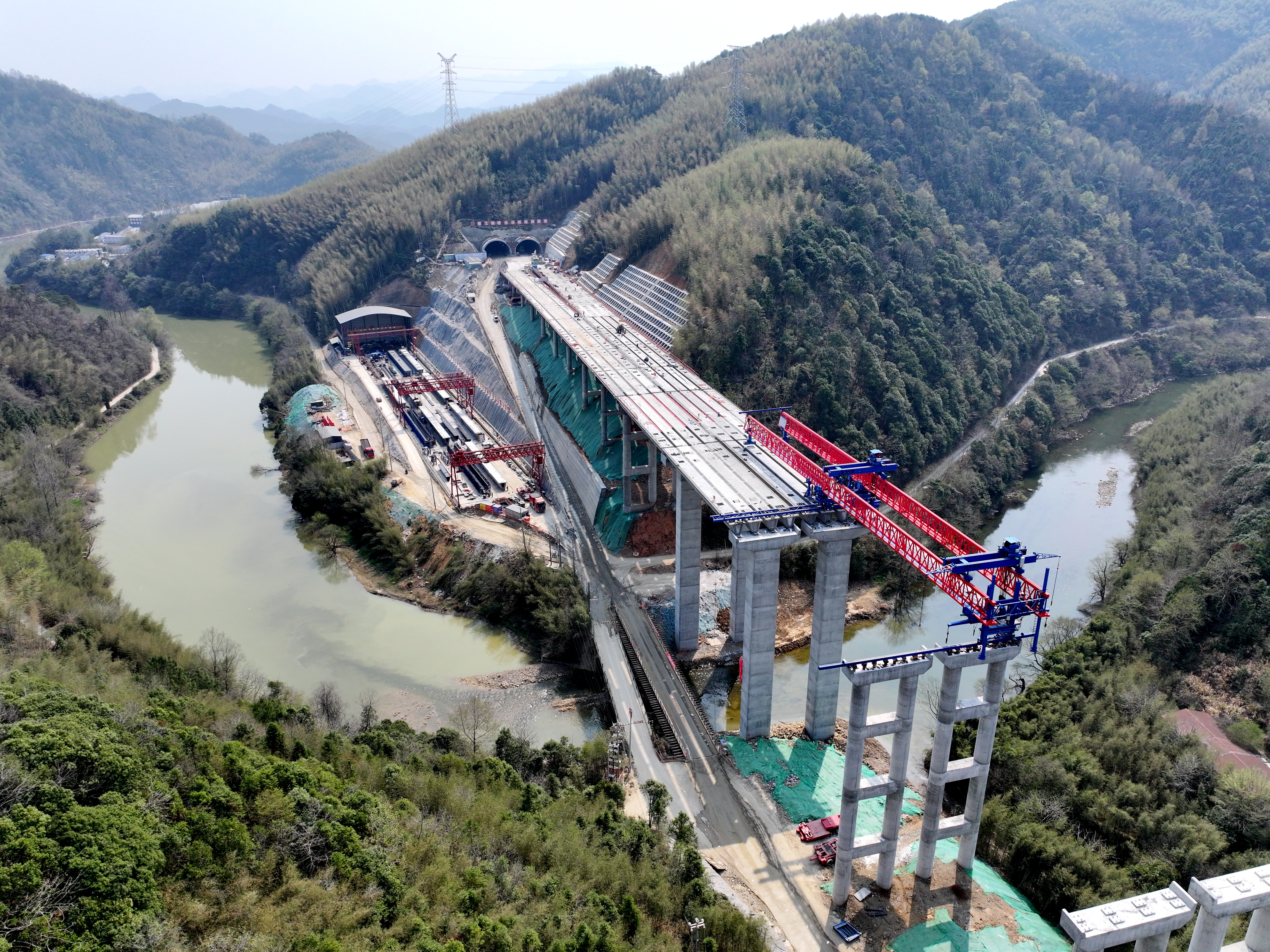 在橋梁施工方面,橫跨浣溪河的特大橋建設(shè)同樣面臨挑戰(zhàn)。為克服12%運梁坡度帶來的困難,項目創(chuàng)新采用“雙主機(jī)雙制動運梁炮車”技術(shù),經(jīng)過多次模擬推演,成功實現(xiàn)首片40米箱梁精準(zhǔn)架設(shè)。這一突破,標(biāo)志著項目施工從下部結(jié)構(gòu)向上部結(jié)構(gòu)轉(zhuǎn)換,實現(xiàn)橋梁與隧道工序無縫銜接,為后續(xù)架梁作業(yè)奠定基礎(chǔ)。截至目前,項目路基填筑已完成98%,橋梁樁基工程全部完工,梁板預(yù)制架設(shè)進(jìn)度突破55%。
