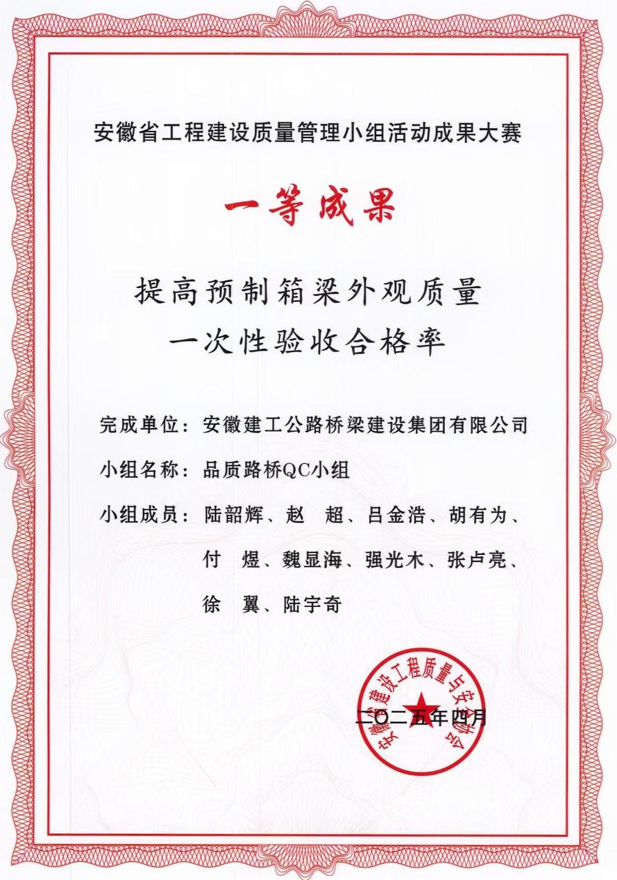 黨支部牽頭組建“品質(zhì)路橋”QC小組,聚焦預(yù)制箱梁外觀質(zhì)量痛點,對材料管理實行原材料進場雙檢,針對性開展關(guān)鍵材料性能試驗;預(yù)制工藝嚴控模板拼裝精度,優(yōu)化混凝土振搗方式。改進后,預(yù)制箱梁外觀合格率從89.67%提升至95.44%,每片修飾時間縮短2小時。成果《提高預(yù)制箱梁外觀質(zhì)量一次驗收合格率》獲安徽省QC成果一等獎,以“紅色匠心”護航工程品質(zhì)。