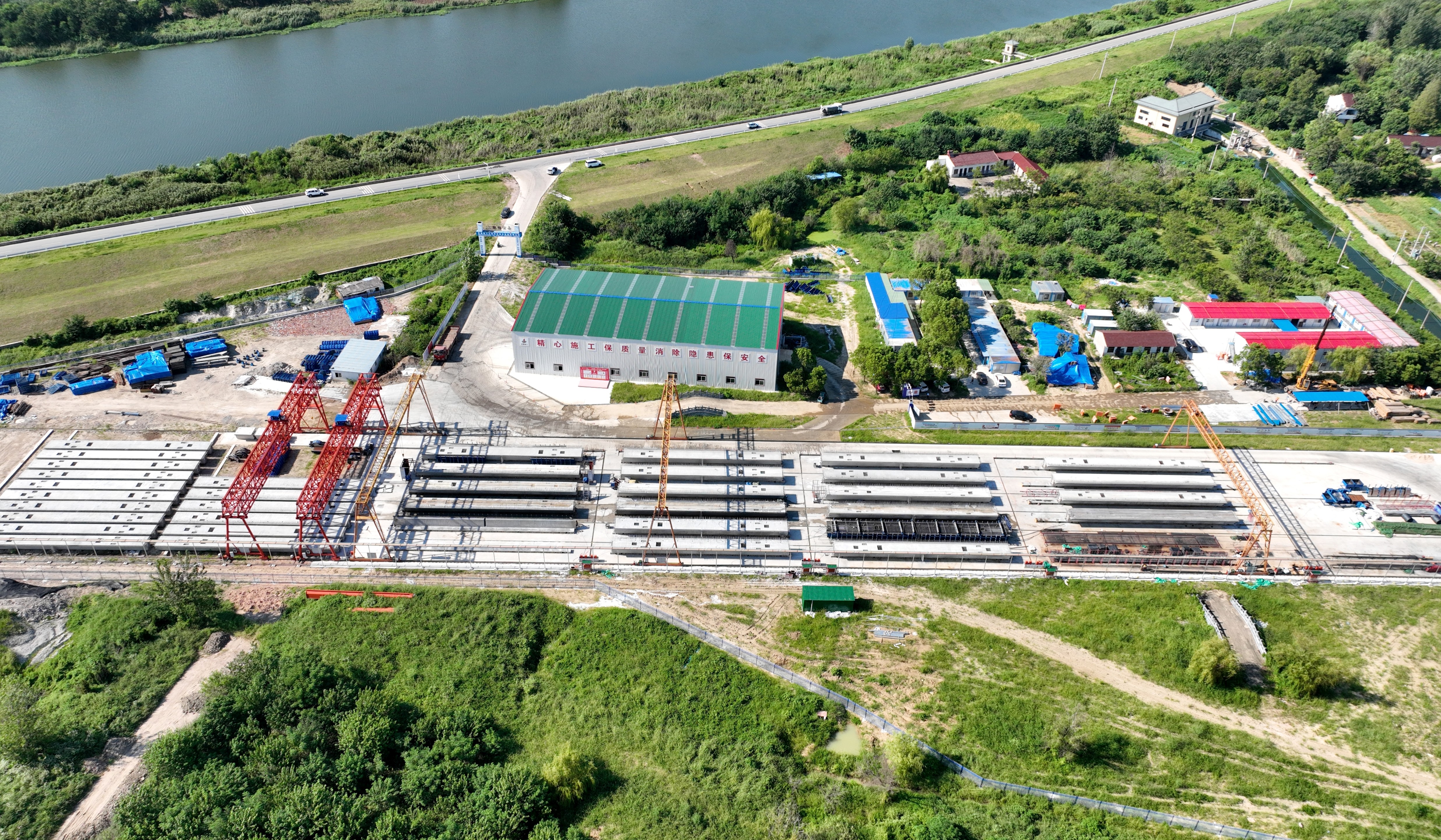 預(yù)制梁場作為橋梁架設(shè)的“后方糧倉”,同樣按下“加速鍵”。項(xiàng)目規(guī)劃的2處標(biāo)準(zhǔn)化預(yù)制梁場,承擔(dān)著全線2130片箱梁的預(yù)制任務(wù),其建設(shè)進(jìn)度與制梁效率直接關(guān)系橋梁架設(shè)的連續(xù)性。其中,1#梁場(占地40畝)擔(dān)負(fù)杭埠河特大橋南岸箱梁預(yù)制工作,目前該梁場生產(chǎn)線進(jìn)入批量生產(chǎn)階段,已完成42片箱梁澆筑;規(guī)模更大的2#梁場(占地70畝)擔(dān)負(fù)杭埠河特大橋北岸、跨三河支線特大橋及東一支渠大橋共1140片箱梁的預(yù)制工作,目前整體建設(shè)進(jìn)入收尾階段,預(yù)計(jì)近期可投入使用,屆時(shí)兩處梁場將形成“南北呼應(yīng)、同步制梁”的產(chǎn)能格局。