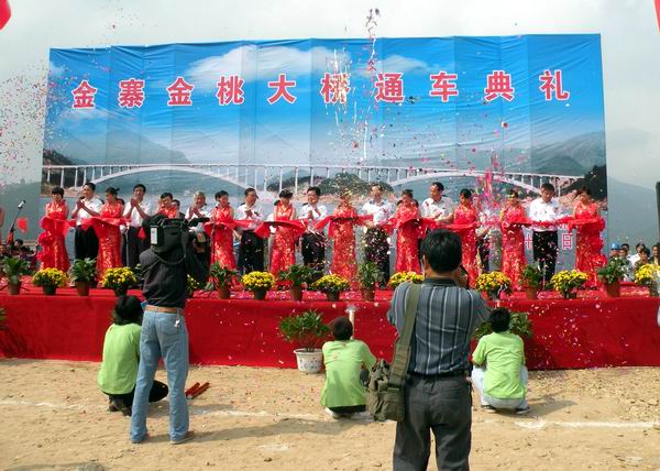 金寨縣委書記沙洪虎在講話中高度贊揚了我公司講政治、重大局、作奉獻(xiàn)的精神。省公路局秦勤局長在代表梅勁廳長的講話中指出,金桃大橋的建成具有極為重要的政治、經(jīng)濟(jì)意義,大橋在施工中填補了省內(nèi)橋梁施工技術(shù)的數(shù)項空白,該橋建成后將大大改善當(dāng)?shù)貒?yán)重落后的交通狀況,對促進(jìn)當(dāng)?shù)氐慕?jīng)濟(jì)發(fā)展,提高人民群眾生活水平,造福老區(qū)人民具有極其重要的意義。