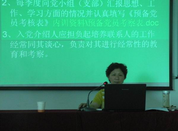 黨委辦公室主任劉昀主持了培訓(xùn)會(huì),并就發(fā)展黨員工作程序,作了專題講座。劉主任通過(guò)PPT課件,系統(tǒng)的介紹了黨員發(fā)展程序,從制訂發(fā)展黨員的工作計(jì)劃開(kāi)始,到預(yù)備黨員轉(zhuǎn)正、整個(gè)入黨材料存入個(gè)人檔案,以及最后的責(zé)任追究都作了詳細(xì)介紹,讓與會(huì)人員對(duì)發(fā)展黨員工作的程序有了清楚的了解。隨后,大家一起觀看了《欲之害——段義和腐敗案件警示錄》。專題片揭露了段義和利用職務(wù)便利大肆索賄的腐敗行徑,深刻揭示了腐化墮落的思想根源和蛻變軌跡。通過(guò)觀看警示教育片,使大家接受了一次深刻的思想教育和精神洗禮,進(jìn)一步認(rèn)識(shí)了在新形式下反腐倡廉建設(shè)的重要性。