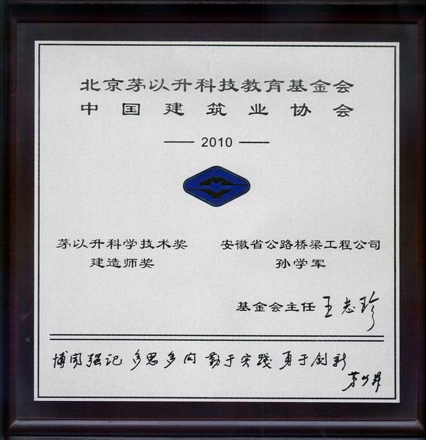 920,由中國(guó)工程院、重慶市政府、國(guó)家外國(guó)專家局和茅以升科技教育基金會(huì)聯(lián)合主辦的“國(guó)際橋梁與隧道工程技術(shù)高峰論壇暨茅以升先生誕辰115周年紀(jì)念大會(huì)”在重慶開(kāi)幕,大會(huì)對(duì)第20屆茅以升科學(xué)技術(shù)獎(jiǎng)獲獎(jiǎng)人員進(jìn)行了頒獎(jiǎng)授牌。公司副總經(jīng)理、正高級(jí)工程師孫學(xué)軍同志榮獲茅以升科學(xué)技術(shù)獎(jiǎng)——建造師獎(jiǎng)。