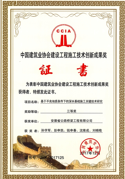 日前,中國建筑業(yè)協(xié)會公布了2017年建設工程施工技術創(chuàng)新成果獲獎名單,公司組織申報的《基于不良地質條件下的深水基礎施工關鍵技術研究》榮獲三等獎。