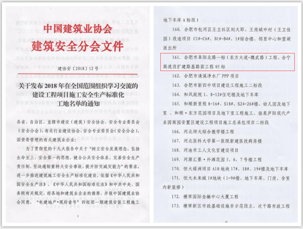 近日,從中國(guó)建筑業(yè)協(xié)會(huì)建筑安全分會(huì)傳來(lái)喜訊,公司承建的阜陽(yáng)北路高架01標(biāo)和合寧高速改擴(kuò)建路基路面工程05標(biāo)兩項(xiàng)工程榮獲“2018年全國(guó)建設(shè)工程項(xiàng)目施工安全生產(chǎn)標(biāo)準(zhǔn)化工地”榮譽(yù)稱(chēng)號(hào)。