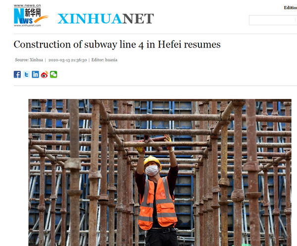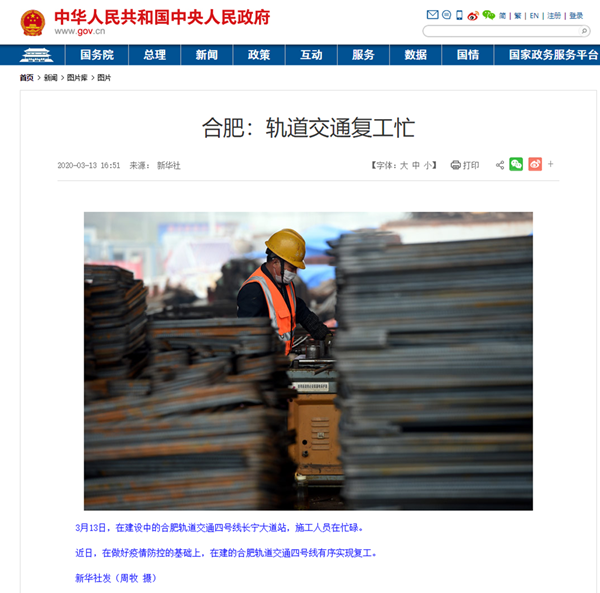 近日,中華人民共和國(guó)中央人民政府官方網(wǎng)站、新華社同時(shí)以《合肥軌道交通復(fù)工忙》為題,報(bào)道了公司承建的合肥軌道交通4號(hào)線長(zhǎng)寧大道站復(fù)工復(fù)產(chǎn)情況,用8張圖片展現(xiàn)了現(xiàn)場(chǎng)全面復(fù)工復(fù)產(chǎn)后的施工場(chǎng)景。