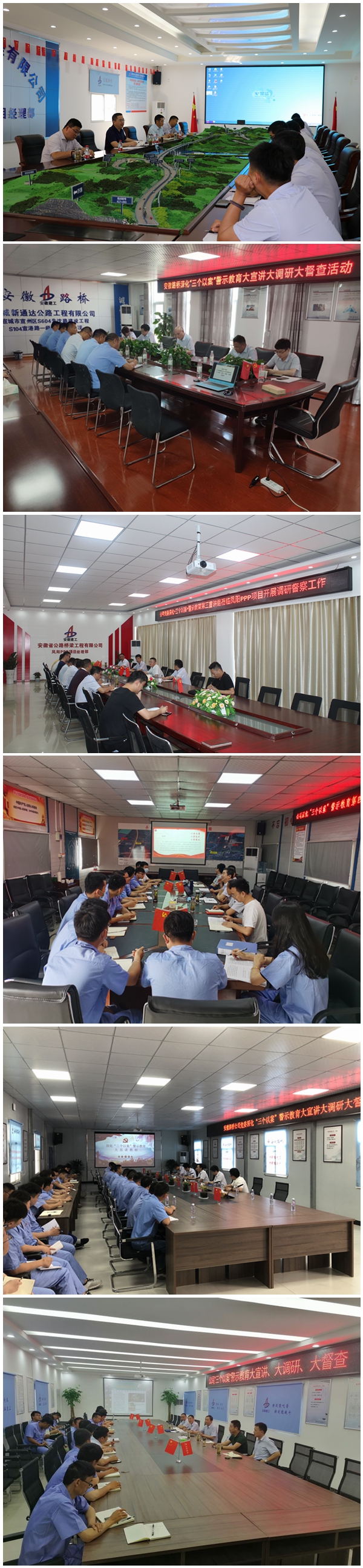 近日,公司黨委深化“三個以案”警示教育9個宣講組分別深入黃河特大橋項目、宣城PPP項目、蒙城PPP項目、明巢高速05標等省內外重點項目、偏遠項目集中開展大宣講、大調研、大督查,宣講警示教育工作要求和典型案例,調研解決項目一線存在的困難和問題,廣泛聽取職工意見建議。