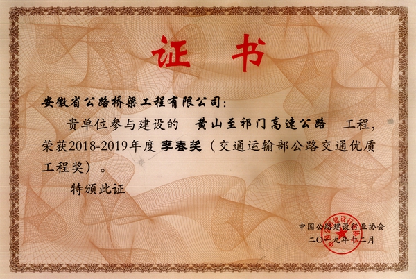 近期,由中國公路建設行業(yè)協(xié)會組織的“全國公路高質(zhì)量發(fā)展云端論壇”正式落幕。期間,以網(wǎng)絡形式頒發(fā)了2018-2019年度李春獎。公司參與建設的“黃山至祁門高速公路”工程榮獲李春獎。