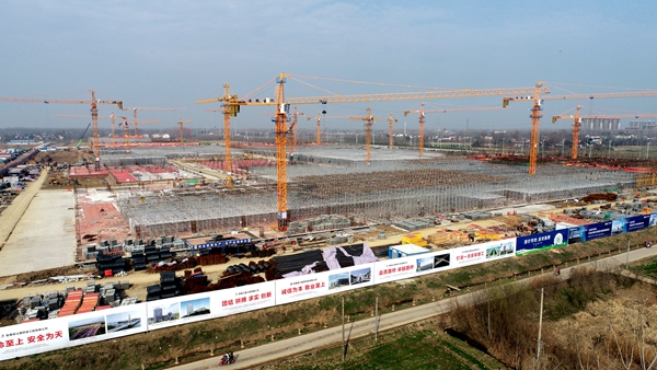 2月12日,農歷大年初一,在舒城縣智慧電子小鎮(zhèn)EPC總承包項目施工現(xiàn)場,數(shù)百名工人正在進行廠房鋼筋幫扎、支架搭設。