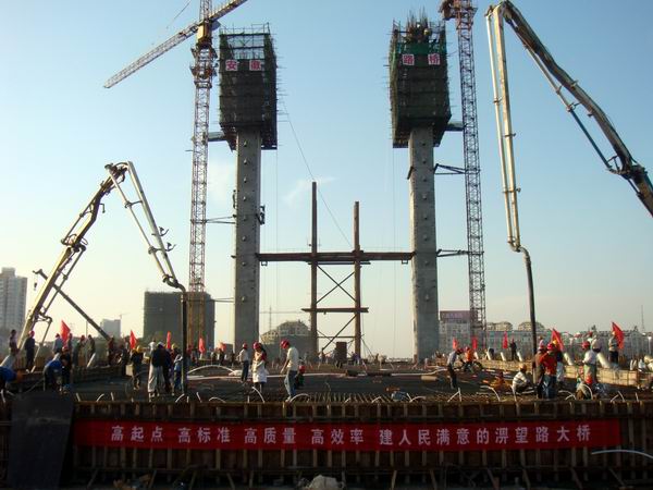淠望路大橋主橋邊跨長85m,砼方量約2800m³,鋼筋約120t。為緊緊抓住秋季黃金施工季節(jié),趕在冬季來臨之前完成更多的生產(chǎn)任務(wù)。項目部經(jīng)認(rèn)真研究、周密論證,決定將原計劃分兩次澆筑的85m邊跨改為一次性澆筑,方量之大在公司歷史上尚屬首次。命令一下,項目部群情激昂、精神振奮、上下一心、紛紛卯足了干勁、準(zhǔn)備大干一把。項目部管理人員全體出動齊上陣,幫助工人穿拉鋼絞線;人員組織、材料設(shè)備安排、質(zhì)量控制、施工力量組織、后勤保障等工作科學(xué)周密、井然有序的迅速落實到位。公司領(lǐng)導(dǎo)更是高度重視,專門為這次大方量砼澆筑在現(xiàn)場召開了生產(chǎn)調(diào)度會,副總經(jīng)理彭申凱、總經(jīng)理助理傅月斌、副總工程師崔林釗等親自到現(xiàn)場督戰(zhàn)。公司還緊急抽調(diào)了合肥市政項目和金桃大橋項目的精兵強(qiáng)將前來鼎力“助陣”。