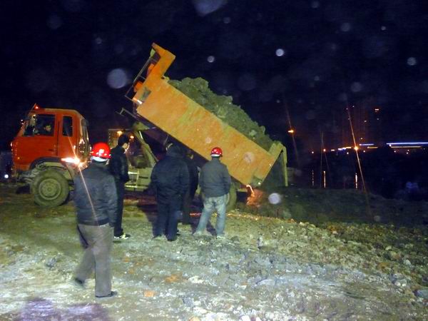 當(dāng)12月19日,宋斗灣路完成第一根樁(位于南淝河北側(cè),屬于3#橋臺)的開挖澆注工作后,項目經(jīng)理部就開始籌劃南淝河南側(cè)的筑島圍堰工作。12月24日,當(dāng)3#橋臺的六根樁全部澆注完成后,當(dāng)天晚上仍繼續(xù)前一晚的筑島工作。每次筑島時,現(xiàn)場橋梁技術(shù)員、測量技術(shù)員和安全員都和工人們一起奮戰(zhàn),而每次奮戰(zhàn)都是一個通宵。截至25日,南淝河筑島圍堰共計用土近270車,約4600方,筑島面積和筑島深度達到預(yù)案和監(jiān)理要求,符合現(xiàn)場施工的實際要求。至此,筑島圍堰工作圓滿完成。