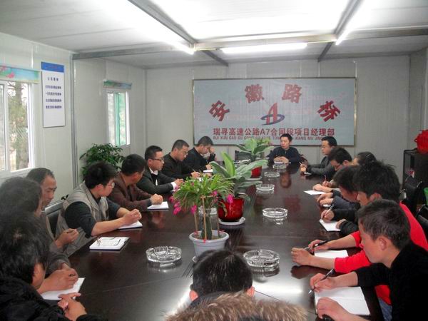 會(huì)上,劉大雷經(jīng)理向全體員工傳達(dá)了五屆二次會(huì)議的工作內(nèi)容要點(diǎn),并帶領(lǐng)大家重點(diǎn)學(xué)習(xí)了公司總經(jīng)理汪衛(wèi)東關(guān)于《夯實(shí)管理基礎(chǔ),拓展發(fā)展空間,為推動(dòng)安徽路橋快速發(fā)展而努力奮進(jìn)》的工作報(bào)告。項(xiàng)目部成員結(jié)合A7標(biāo)施工實(shí)際,就汪總工作報(bào)告中闡述的2010年奮斗目標(biāo)和工作思路等內(nèi)容,進(jìn)行了深入探討。瑞尋高速工程作為我公司進(jìn)駐江西市場(chǎng)戰(zhàn)略中第一個(gè)中標(biāo)項(xiàng)目,A7標(biāo)的工作目標(biāo)不僅僅是完成這一具體工程,更深層次的是要打造品牌質(zhì)量,樹立起公司形象,進(jìn)而開拓江西市場(chǎng)。在具體思路上,要以“和諧、奮進(jìn)、創(chuàng)新、共贏”為宗旨,制定好周、月以及季度的施工計(jì)劃,強(qiáng)化項(xiàng)目管理,提高經(jīng)濟(jì)效益。同時(shí),劉經(jīng)理提出工程的季度產(chǎn)值目標(biāo)和年度產(chǎn)值目標(biāo),希望各部門、各工區(qū)相互配合,共同完成每個(gè)階段的工程任務(wù)。