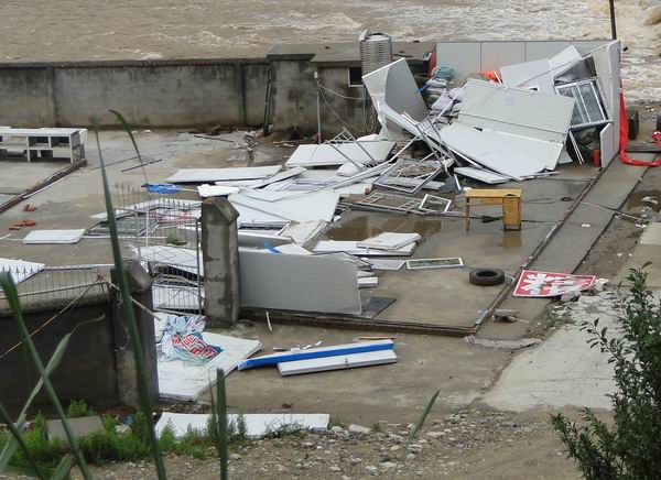 晚上7時(shí),一場夾雜著暴雨的罕見龍卷風(fēng)襲擊二工區(qū),此次龍卷風(fēng)來勢猛,伴隨雷陣雨,短時(shí)間內(nèi)河道水位迅速上漲。據(jù)當(dāng)?shù)乩先酥v,該地區(qū)從沒有出現(xiàn)過如此大的龍卷風(fēng)。龍卷風(fēng)過后,樹木被折斷,我項(xiàng)目二工區(qū)剛修復(fù)房子全部被吹走、便橋被沖毀、梁場兩座龍門架倒塌、施工班組居住的房屋被掀翻,現(xiàn)場一片狼藉。