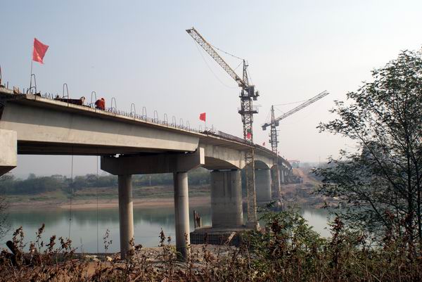 青弋江大橋全長(zhǎng)454米,凈寬11米,結(jié)構(gòu)形式為30×10+70+42×2的簡(jiǎn)支箱梁與現(xiàn)澆懸臂橋。該工程于2007年開工,前期由于施工條件的限制和其它不利因素,工程進(jìn)展頗不順利。后來(lái)在公司領(lǐng)導(dǎo)的大力支持下,全體施工人員上下合力,積極創(chuàng)造條件進(jìn)行施工,全橋終于順利合龍。盛總在合龍現(xiàn)場(chǎng)指出,雖然大橋已順利合龍貫通,但后期任務(wù)還相當(dāng)艱巨,橋面、護(hù)欄、橋頭搭板和護(hù)坡等都需要抓緊施工,在保證質(zhì)量、保證安全的情況下,組織力量加快施工進(jìn)度,確保實(shí)現(xiàn)元月通車的目標(biāo)。