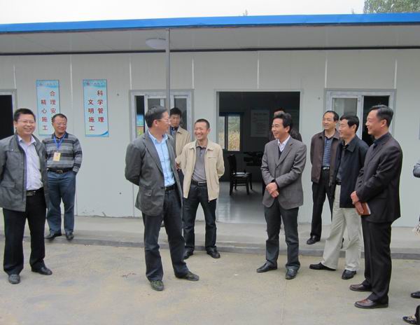 王傳鵬一行先來到我標(biāo)段正在建設(shè)中的預(yù)制場拌合站,并聽取了項(xiàng)目經(jīng)理杜海峰的匯報(bào)。接著來到我標(biāo)段項(xiàng)目部,調(diào)研項(xiàng)目駐地建設(shè)情況,就項(xiàng)目駐地建設(shè)作出具體指導(dǎo)。他要求項(xiàng)目駐地的實(shí)驗(yàn)室及相關(guān)配套設(shè)施要盡早完備,并指出在地方事務(wù)上,出現(xiàn)問題要及時(shí)與縣指和鄉(xiāng)鎮(zhèn)進(jìn)行溝通,協(xié)調(diào)解決。同時(shí),他要求縣指繼續(xù)做好各項(xiàng)協(xié)調(diào)工作,確保蚌固路改造工程于10月底順利施工。